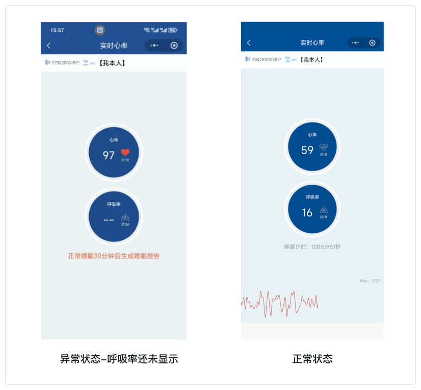 为什么睡眠体念小程序实时心率页面的呼吸率会出来得慢一 些?Health And Fitness, Questions, Smart Senior Care, Sleep Monitor / 健康产业, 健康检测, 健康管理, Elderly Care & Monitor, 养老床垫, 养老院, 助眠, 助眠睡眠监测, Respiration Rate, 呼吸频率, 居家养老, Heart Rate, 心率监测, Smart Senior Care, 智能家居, 智能家居系统, Smart Mattress, 智能床系统, 睡眠, 睡眠体念小程序, 睡眠健康, 睡眠呼吸监测, 睡眠心率监测, 睡眠检测, Sleep Monitor, 睡眠监测仪, 睡眠监测垫, 睡眠监测系统, 睡眠管理, Sleep Tracking Recorder, 睡眠记录仪常见问题, 睡眠记录仪常见问题解答 刚开始进入睡眠监测时,监测结果会有一些延迟,一般在人体保持静息状态大概30秒后,会显示实时数据。首先显示的是心率,其次是呼吸率,因为呼吸率的频率低于心率,算法学习时间要长一些,所以显示会慢一些。